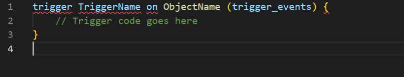 - ObjectName is the name of the object for which you are creating the trigger (e.g., Account, Contact, Opportunity).